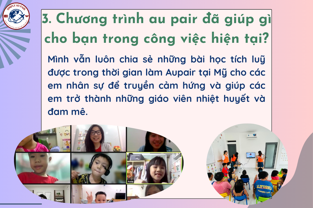 Cô thường xuyên chia sẻ lại những bài học tích lũy trong thời gian làm Au Pair cho đội ngũ nhân sự của mình, để truyền cảm hứng, giúp các bạn trẻ trở thành những giáo viên: